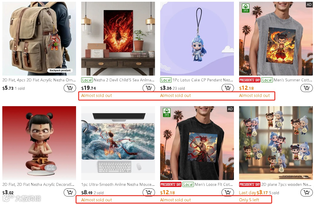 在 Temu 平台,不少卖家上架了哪吒敖丙的亚克力摆件、哪吒鼠标垫、哪吒版画、T 恤、手机壳等,售价大多在 5-20 美金左右,有些产品甚至已经打上库存所剩不多的标签,可见产品的抢手程度。