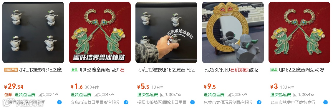 更有趣的是,《哪吒2》中的一些配角也成为了跨境卖家争相追捧的对象。例如,情绪稳定内核强大的石矶娘娘,被称为“最强辅助”的蠢萌结界兽。在 1688 平台上,大量与石矶娘娘和结界兽相关的周边产品,如冰箱贴和手机壳,也获得了一定的销量。