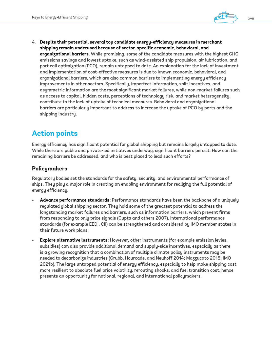 报告强调了短期运营措施(例如各种形式的港口停靠和航速优化)与中期技术创新(例如风助推进)在实现显著效率提升方面的作用。报告指出了实施过程中持续存在的经济、行为和组织障碍,并通过两个案例研究——即港口停靠优化和风助推进——对此进行了探讨,展示了克服这些障碍的创新方法。