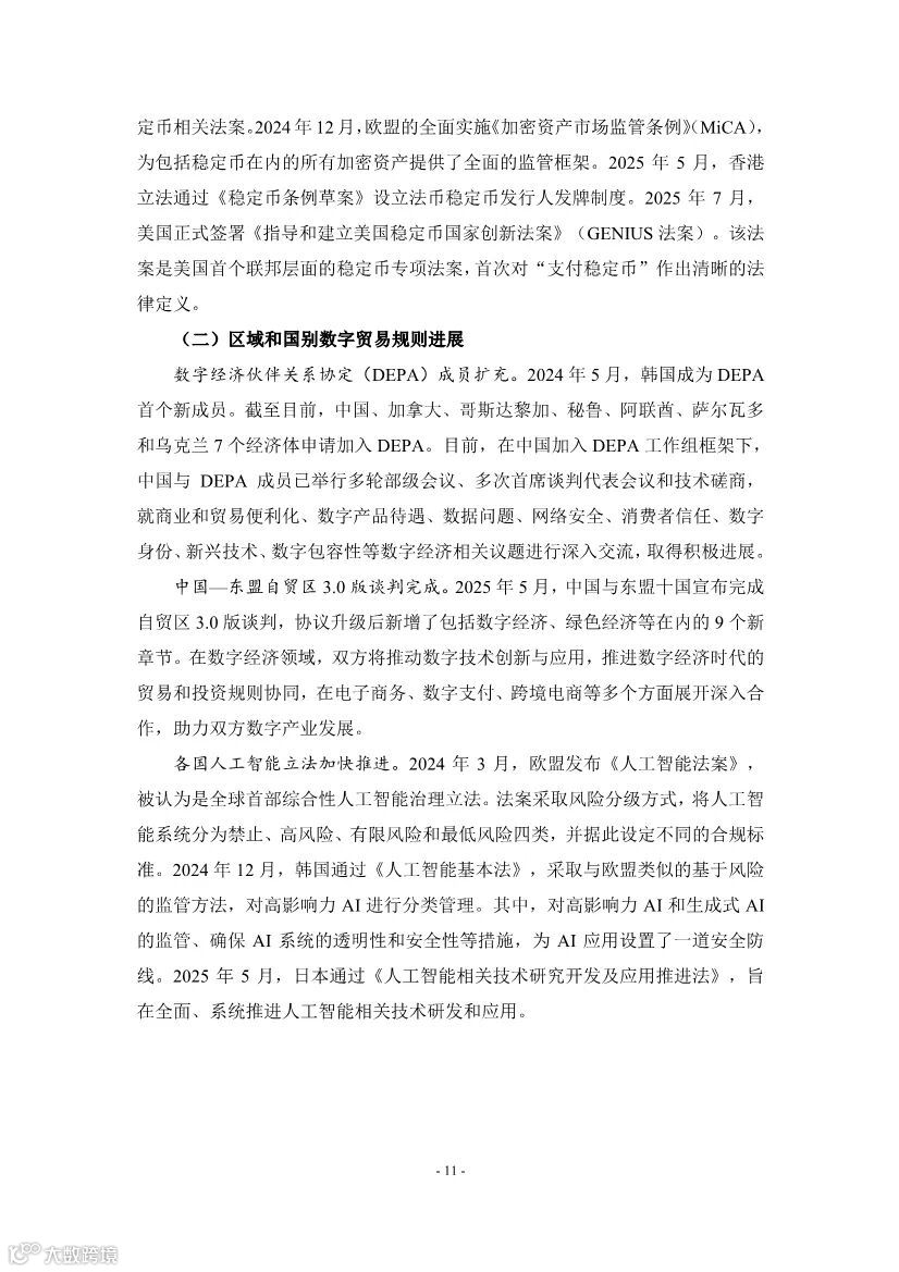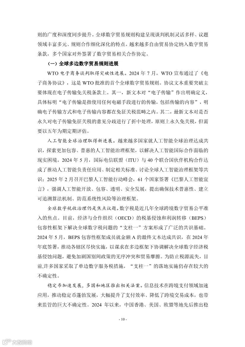 - 全球数字贸易治理:WTO通过《电子商务协议》,人工智能全球治理取得新进展,数字税和稳定币成为焦点议题。