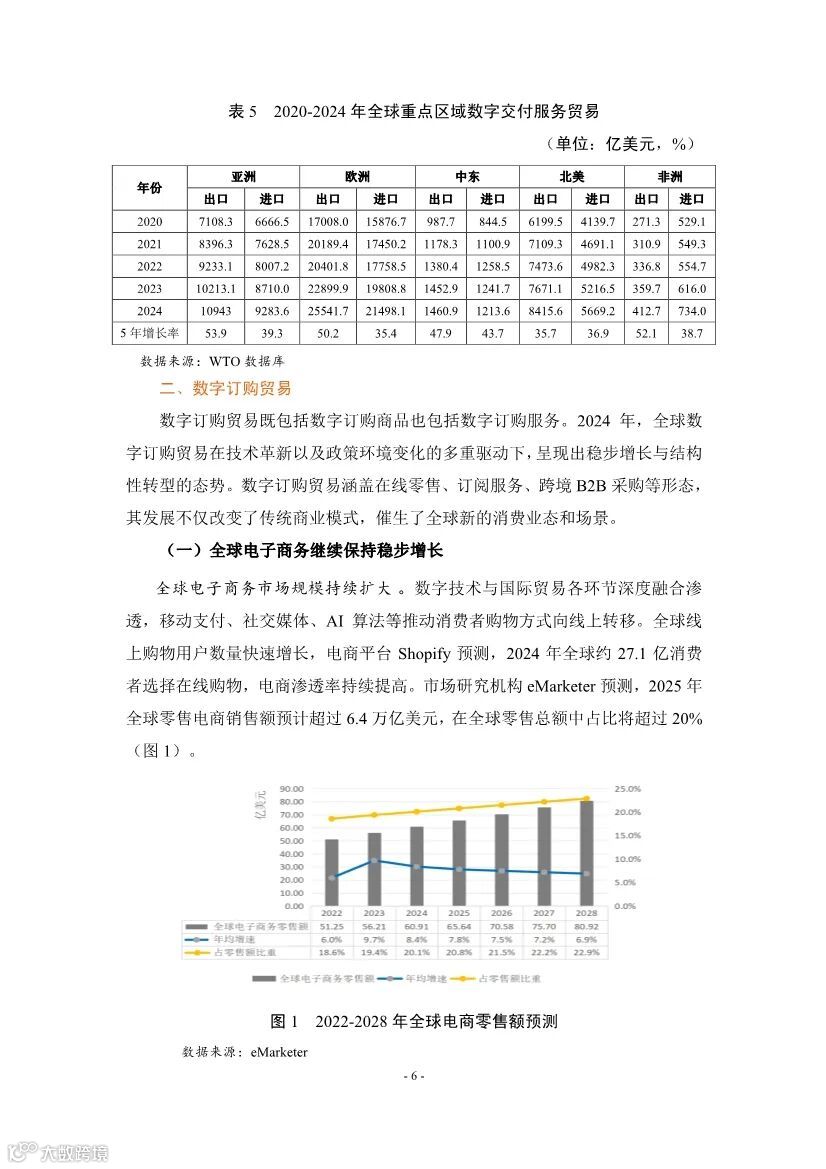 - 数字订购贸易:包括数字订购商品和服务,如在线零售、订阅服务等,2024年呈现稳步增长与结构性转型态势。