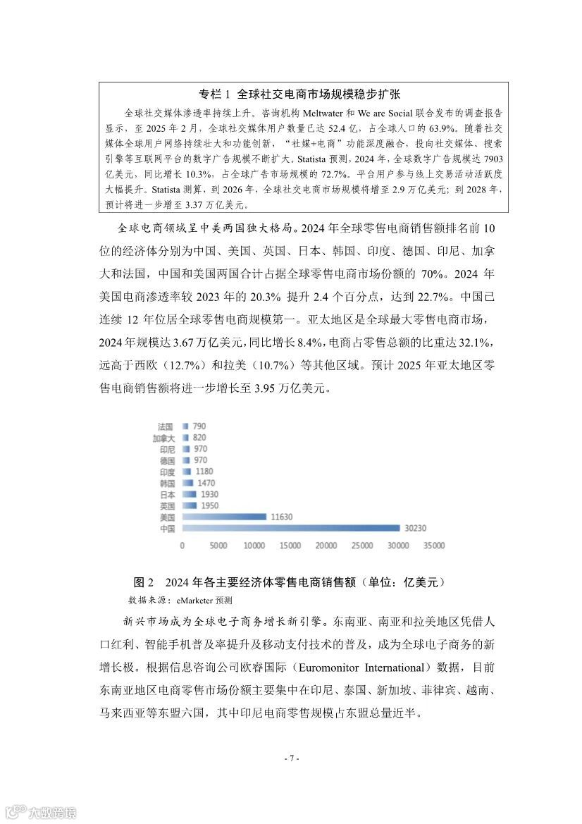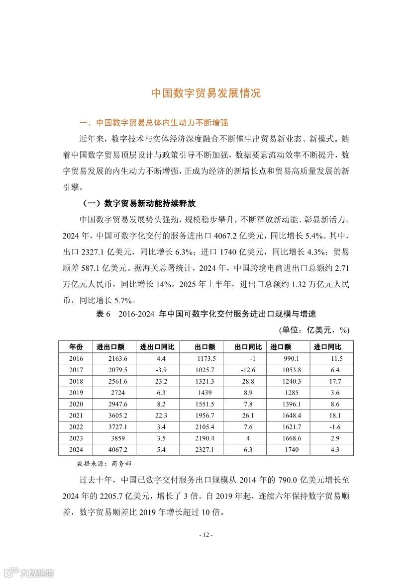 - 总体内生动力:中国数字贸易发展势头强劲,2024年可数字化交付的服务进出口规模达到4067.2亿美元,同比增长5.4%。跨境电商进出口总额约2.71万亿元人民币,同比增长14%。