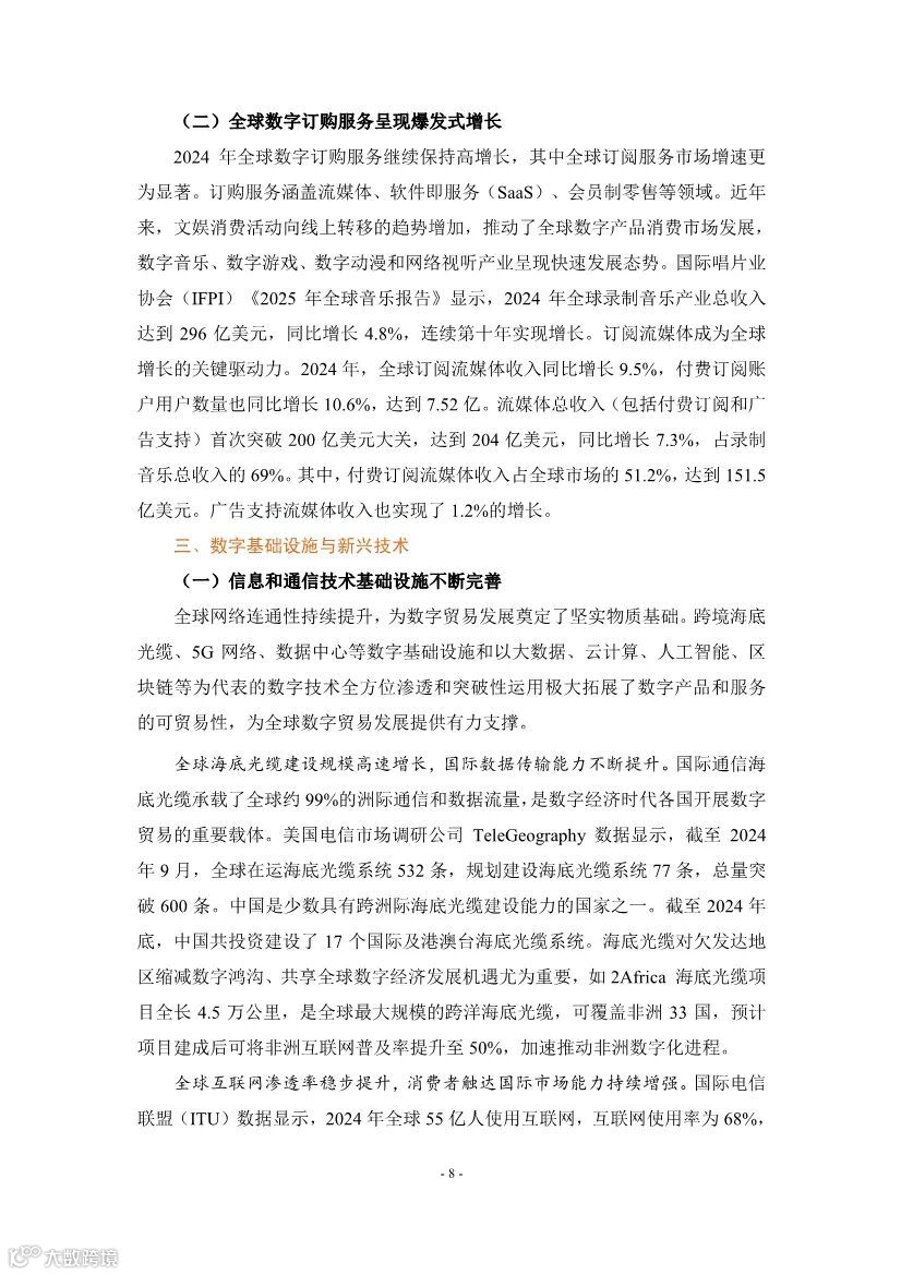 - 数字基础设施与新兴技术:全球网络连通性提升,5G网络、数据中心等基础设施建设加速,人工智能应用呈现爆发式增长。