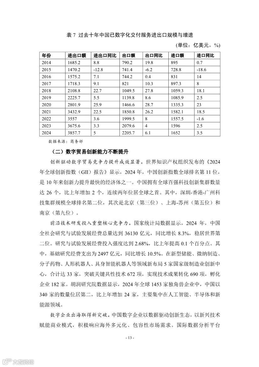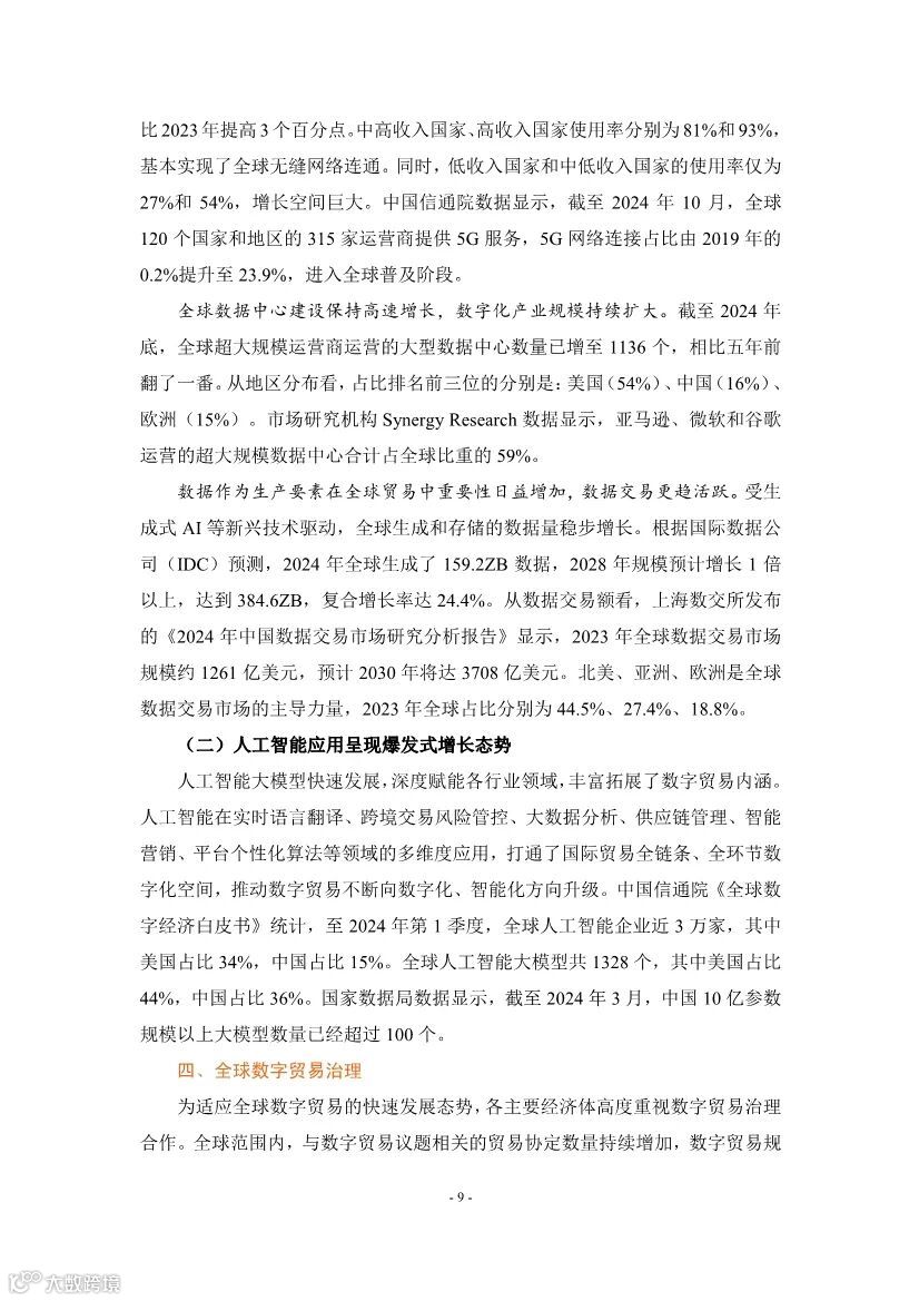 - 政策实践:《关于数字贸易改革创新发展的意见》发布,推动数字贸易制度型开放,完善数字贸易治理体系。