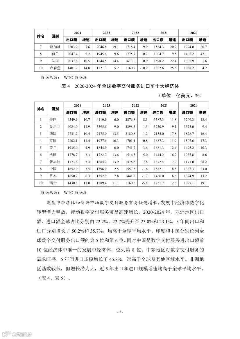 - 发达经济体与发展中经济体:发达经济体在全球数字交付服务贸易中占比高,但发展中经济体增长迅速。亚洲地区出口额和进口额全球占比分别提升至23.0%和23.1%。
