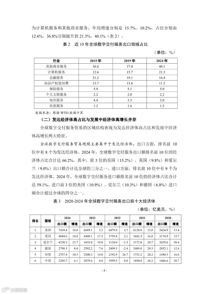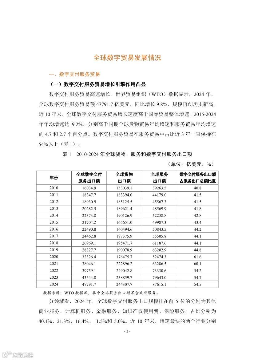 - 数字交付服务贸易:2024年全球数字交付服务贸易额达到47791.7亿美元,同比增长9.8%,占服务贸易的比重保持在54%以上。计算机服务和其他商业服务是增长最快的领域。