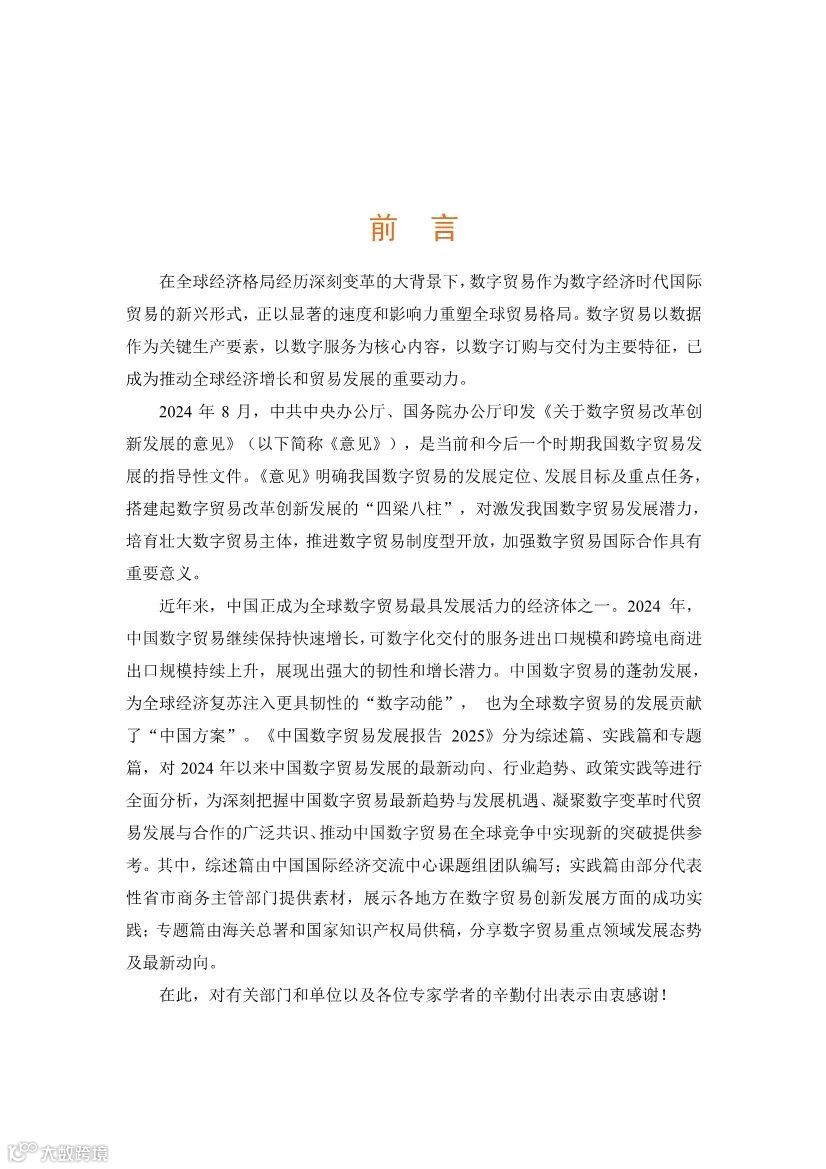 这份报告是《2025年中国数字贸易发展报告》,由中华人民共和国商务部发布,全面分析了2024年以来中国数字贸易的发展情况、政策实践、创新实践以及未来发展趋势。报告分为综述篇、实践篇和专题篇,涵盖了全球和中国数字贸易的现状、部分省市的创新实践以及重点领域的发展态势。