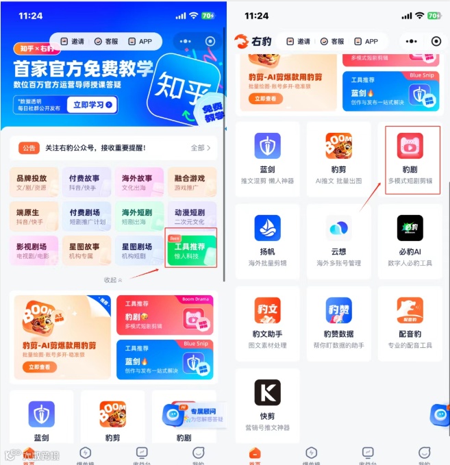 1.首先我们打开小程序右豹,然后找到工具推荐,选择豹剧,最后我们上传需要剪辑的短剧素材,它就能自动识别视频的爆点,将爆点前置,自动剪辑,很大程度上节约了我们剪辑视频的时间。