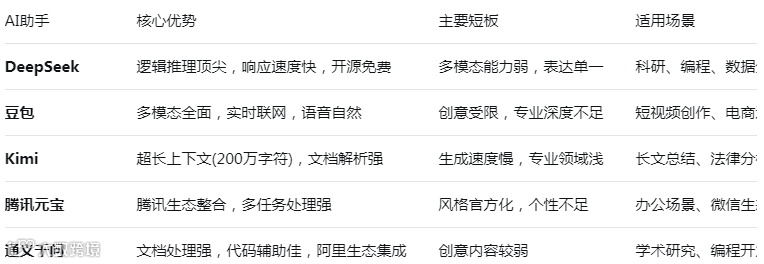 组合使用可能是当前的最佳策略——根据需要切换不同的AI工具,比如同时使用DeepSeek处理专业任务和豆包进行创意工作,通义千问处理文档分析,这样才能充分发挥各自优势,弥补单一工具的不足。