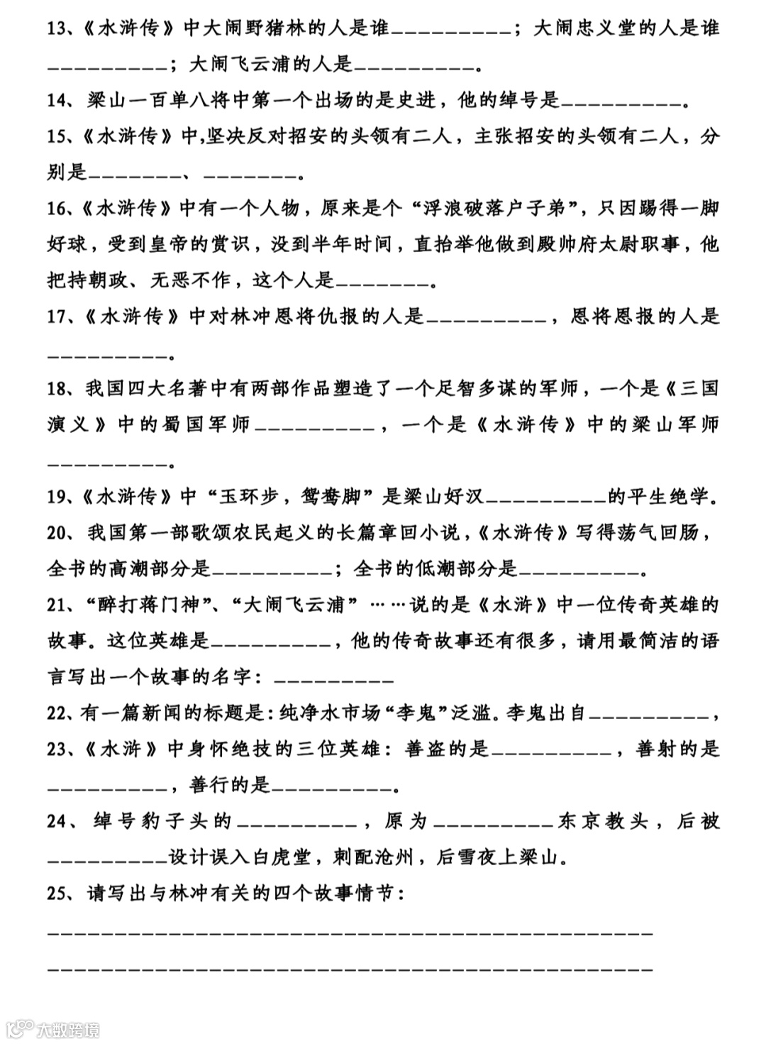 25、请写出与林冲有关的四个故事情节:误闯白虎堂、风雪山神庙、火烧草料场、雪夜上梁山