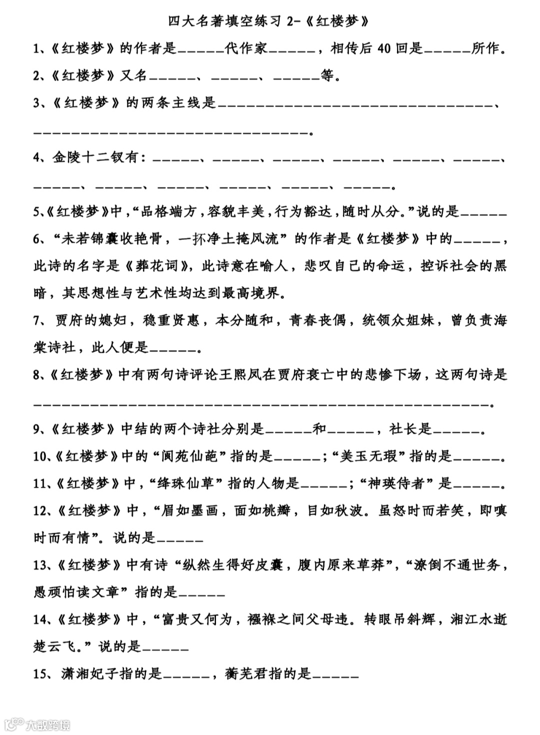 《西游记》《红楼梦》《水浒传》《三国演义》是中国古典四大名著。四大名著是五年级下册快乐读书吧的推荐书目,可以阅读完之后,尝试完成下面的练习。