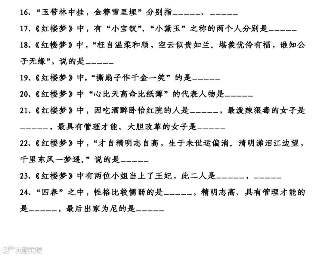 10、《红楼梦》中的“阆苑仙葩”指的是林黛玉;“美玉无瑕”指的是贾宝玉。