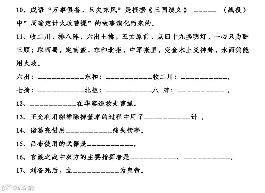 1、诸葛亮与周瑜联手指挥的一场著名的以少胜多的战例,是赤壁之战;再说出诸葛亮挥泪斩马谡是因为失街亭一事。