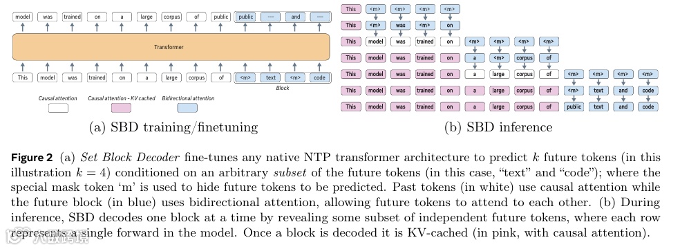 研究人员提出了一种名为 Set Block Decoding(SBD)的新范式,通过在单一架构中整合标准的 next token prediction(NTP)和 masked token prediction(MATP),加速语言模型的生成过程