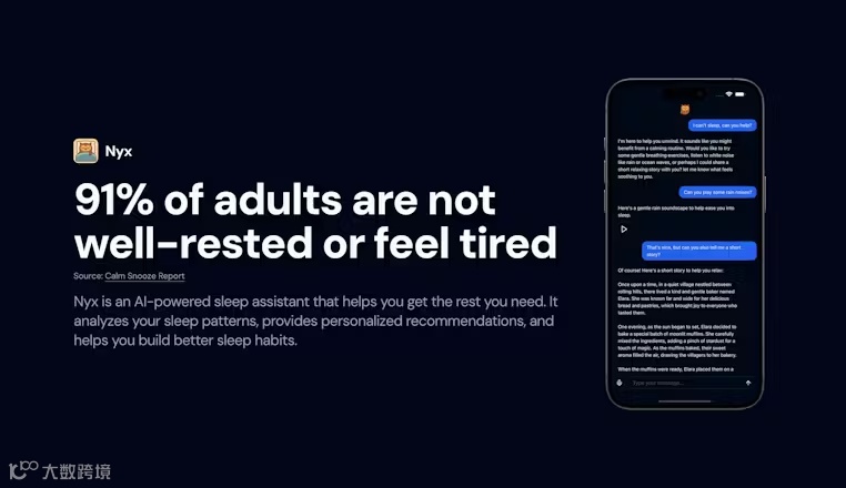 Nyx 帮助用户摆脱睡前刷屏困扰,通过舒缓的语音对话、睡前故事和自适应作息安排,引导用户更快进入睡眠状态
