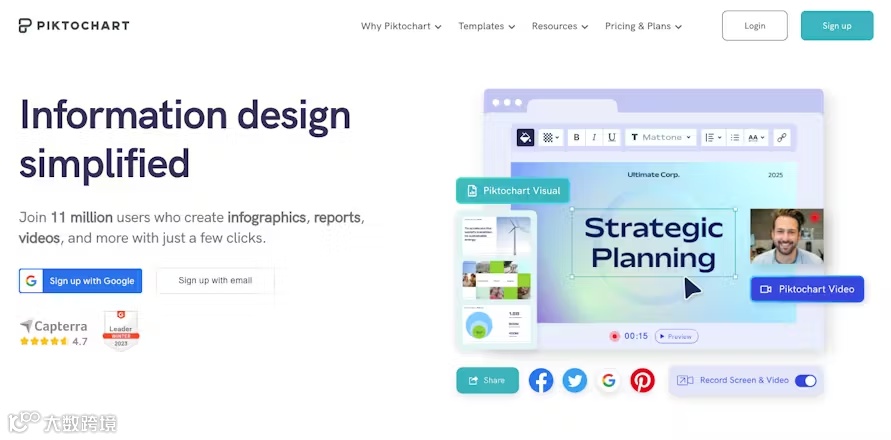 Piktochart 帮助用户轻松创建信息图表、传单、海报、演示文稿和报告,无需任何设计经验即可完成专业级视觉作品