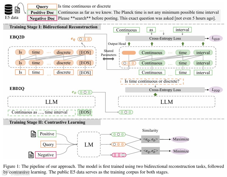 研究人员提出了一种新的训练阶段,旨在通过双向生成重建任务(即 EBQ2D 和 EBD2Q)丰富最终 token 嵌入的语义,从而提升 LLM 作为文本嵌入器的能力