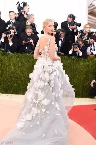 2016年5月3日, 在纽约大都会博物馆慈善晚宴 (Met Gala)上, Karolina Kurkova穿着由设计师Marchesa和人工智能Watson协同设计的白色薄纱发光礼服。
