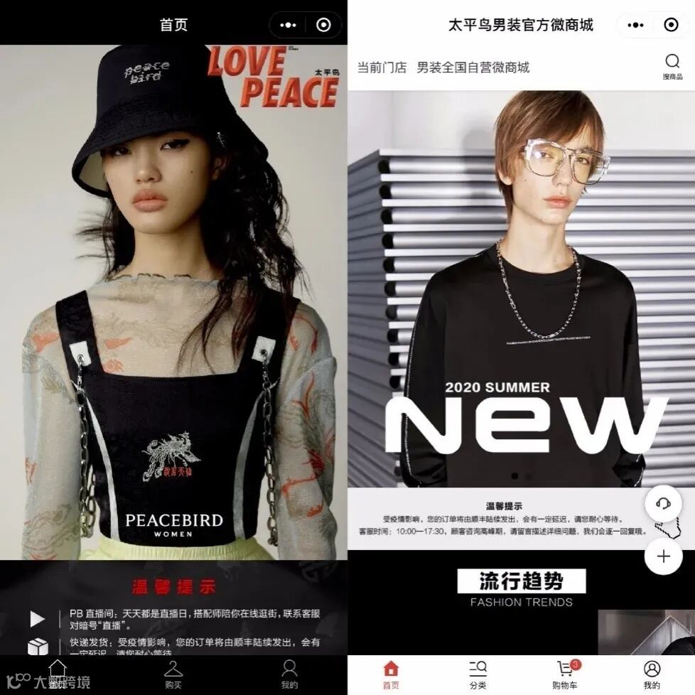 太平鸟女装“鸟嗒”小程序(左)、男装官方微商城(右)