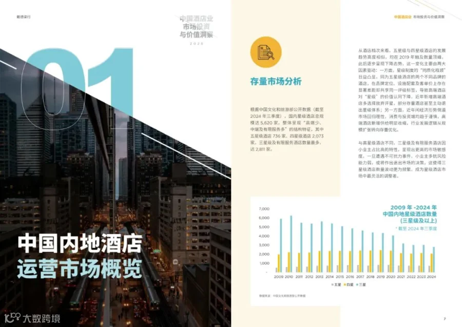 - 中国酒店市场已进入存量时代,星级酒店总数达5,620家,其中五星级酒店736家,四星级酒店2,073家,三星级及有限服务酒店2,811家。