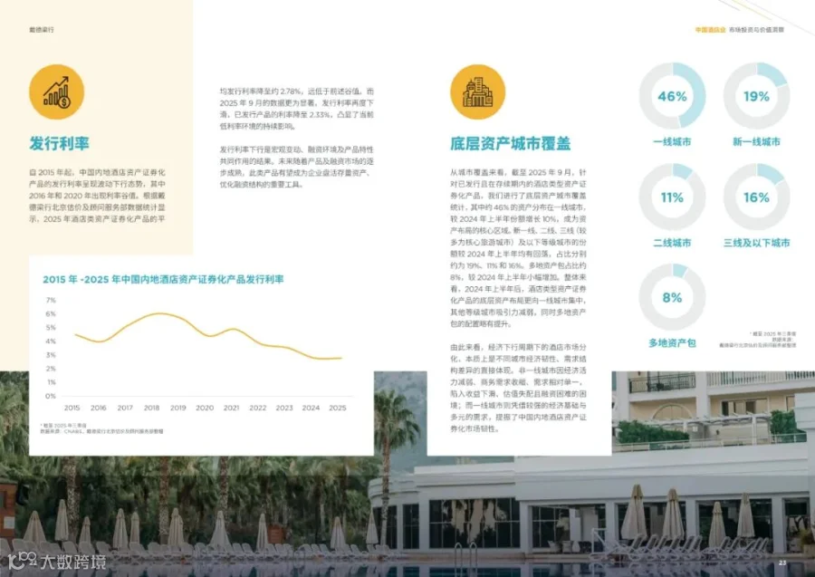 - 2025年酒店类资产证券化产品的平均发行利率降至约2.78%,显示出低利率环境的持续影响。