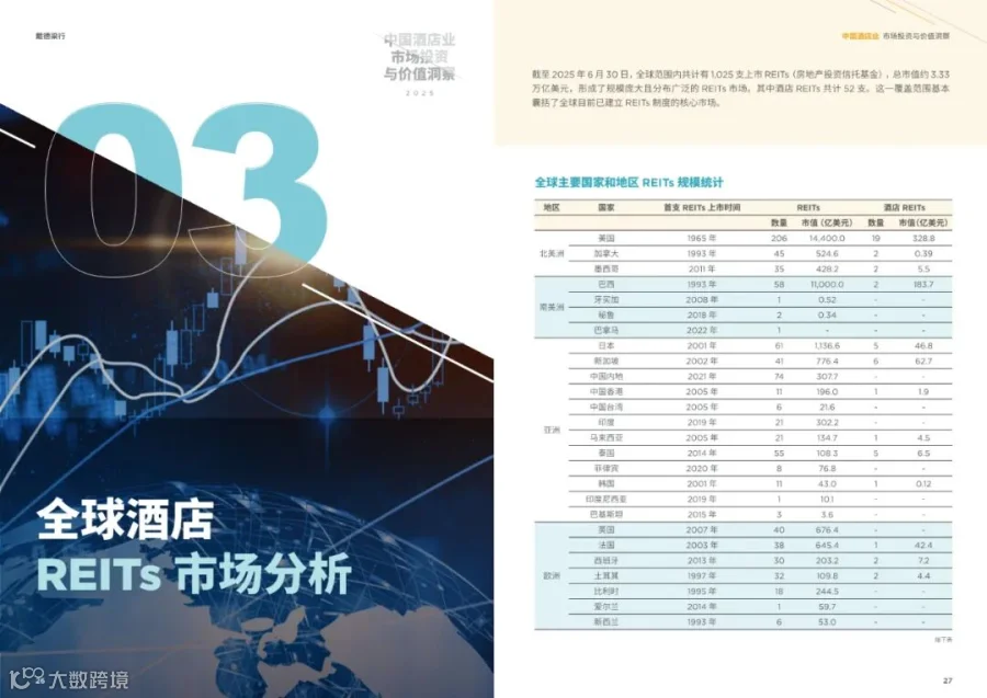 - 截至2025年上半年,全球共有1,025支上市REITs,总市值约3.33万亿美元,其中酒店REITs共计52支。
