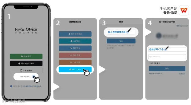 打开WPSapp,点击左上角头像,选择「更多登录方式」-「第三方企业码」,输入YMU,点击「验证」,跳转到统一身份认证界面,登录后即可激活应用。