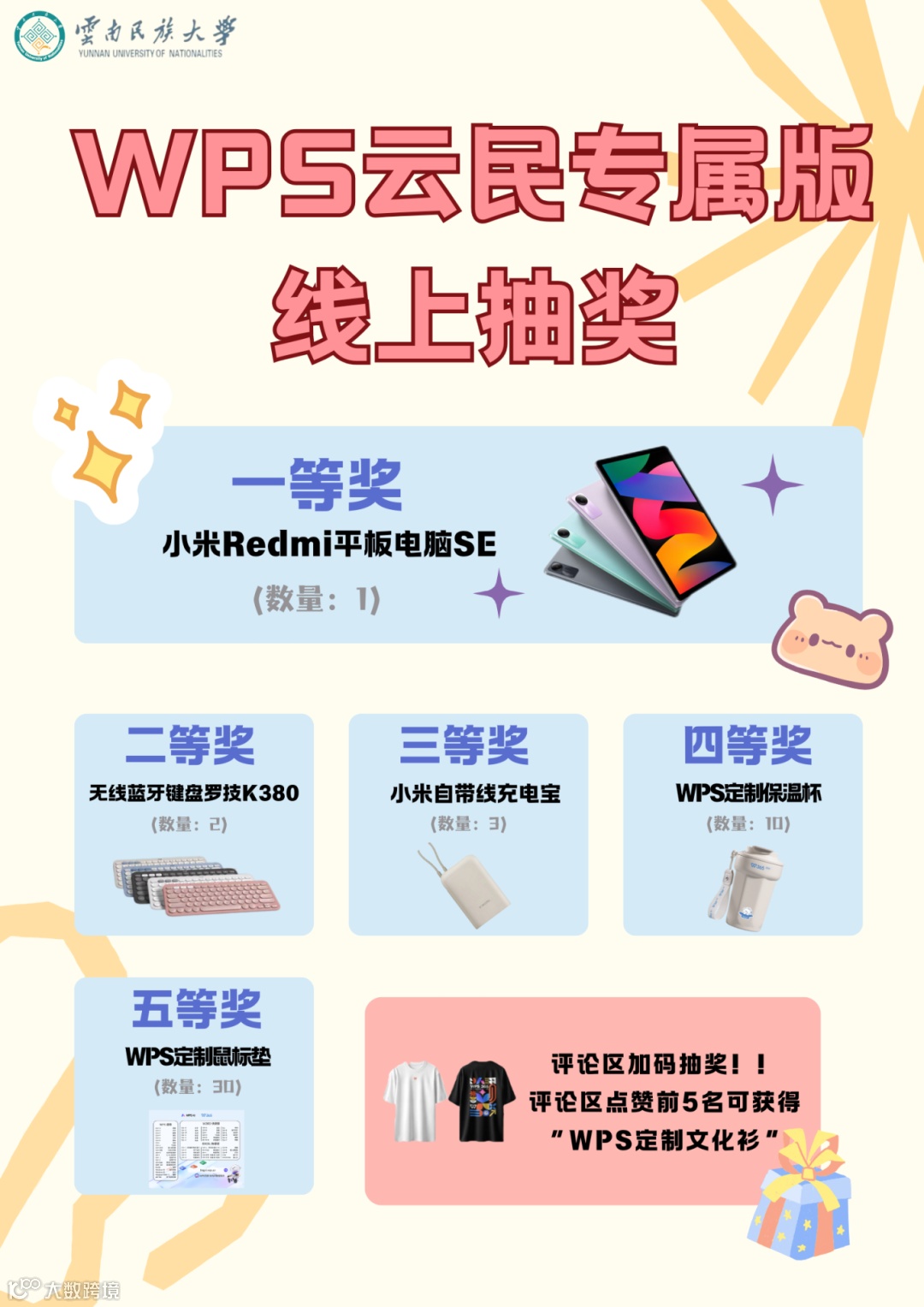 注:领奖时需提供转发朋友圈截图(所有人可见)+已激活WPS校园账号登录截图+带上云民一卡通。