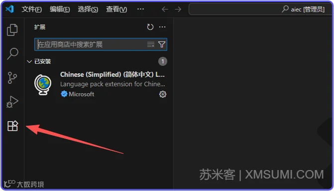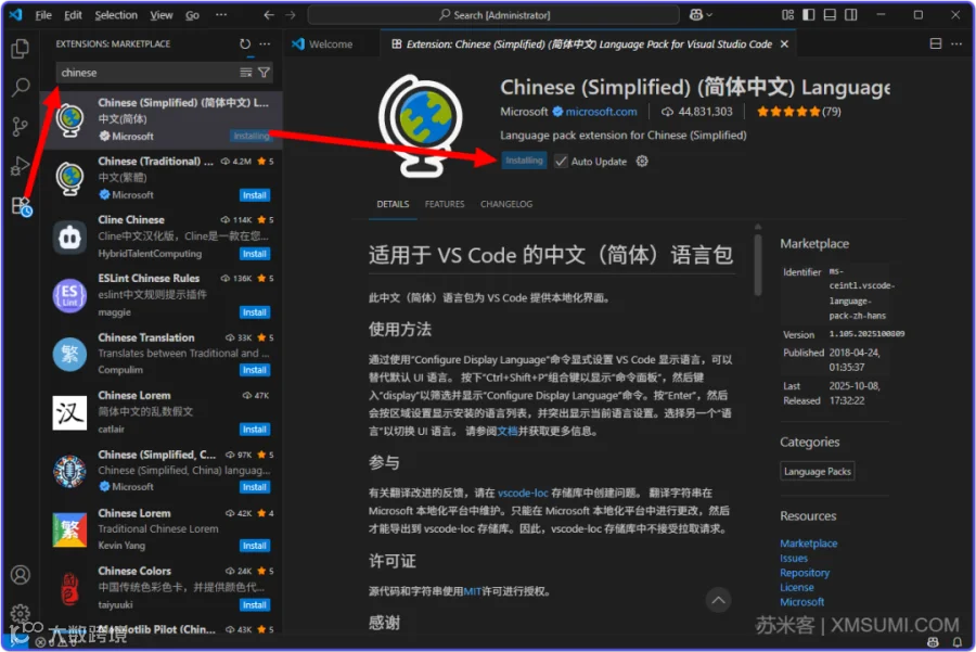 对于刚使用VS Code的新手建议先安装语言包,直接搜索Chinese找到这个简体中文点击「安装」