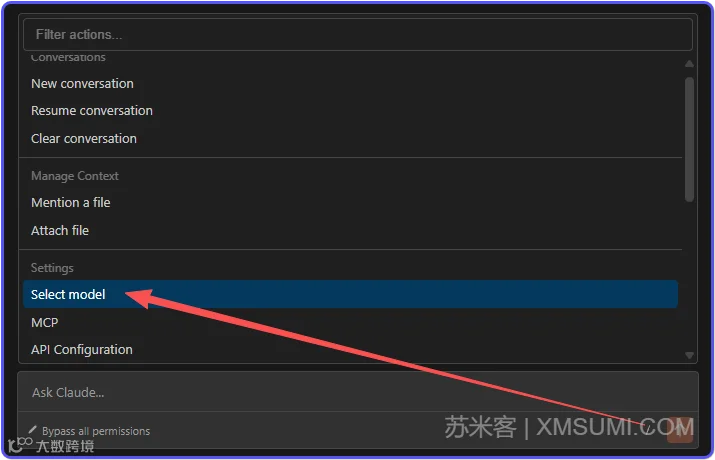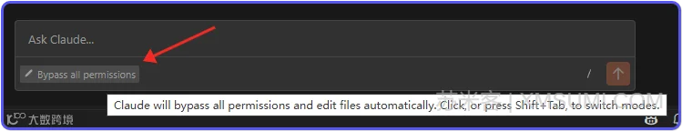 直接在输入框点击就可以切换模式,看到这个就说明切换到Bypass all permissions模式了