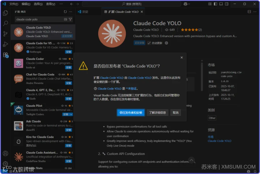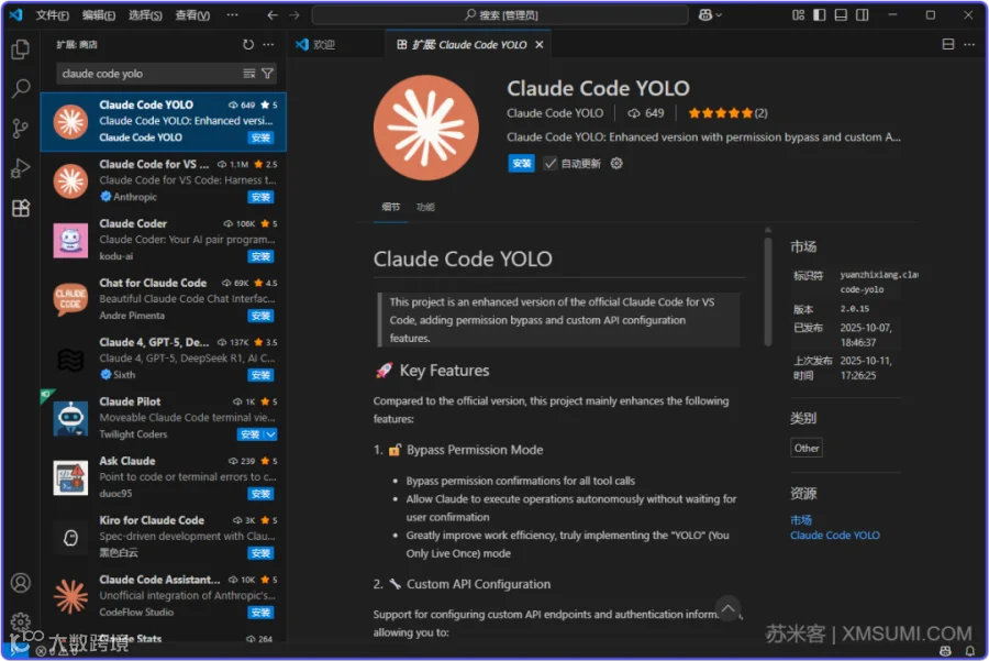 打开 VS Code → 点击左侧扩展图标,然后搜索claude code yolo,再点安装即可