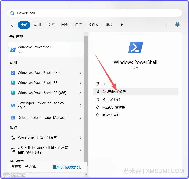 2)WIN键,在弹出搜索中搜索“PowerShell”,「以管理员身份运行」