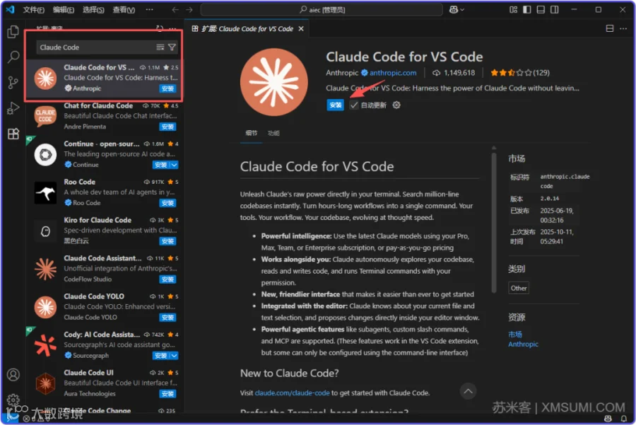 搜索关键字 Claude Code 可以看到第一个Claude Code for VS Code,注意有官方认证的Anthropic,点击「安装」