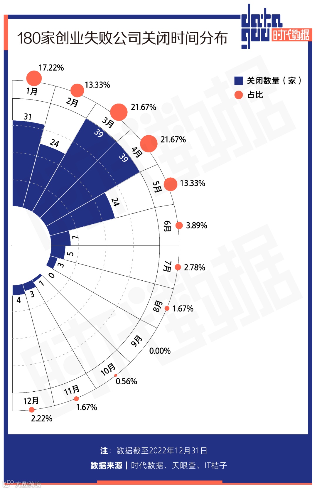 据时代数据创业公司数据库统计,截至2022年12月31日,全年共有180家创业公司关闭,较2021年的约800家减少近八成。从时间分布看,3月和4月关闭数量最多,均为39家,占比21.67%;1月关闭31家;2月和5月各24家[k]。