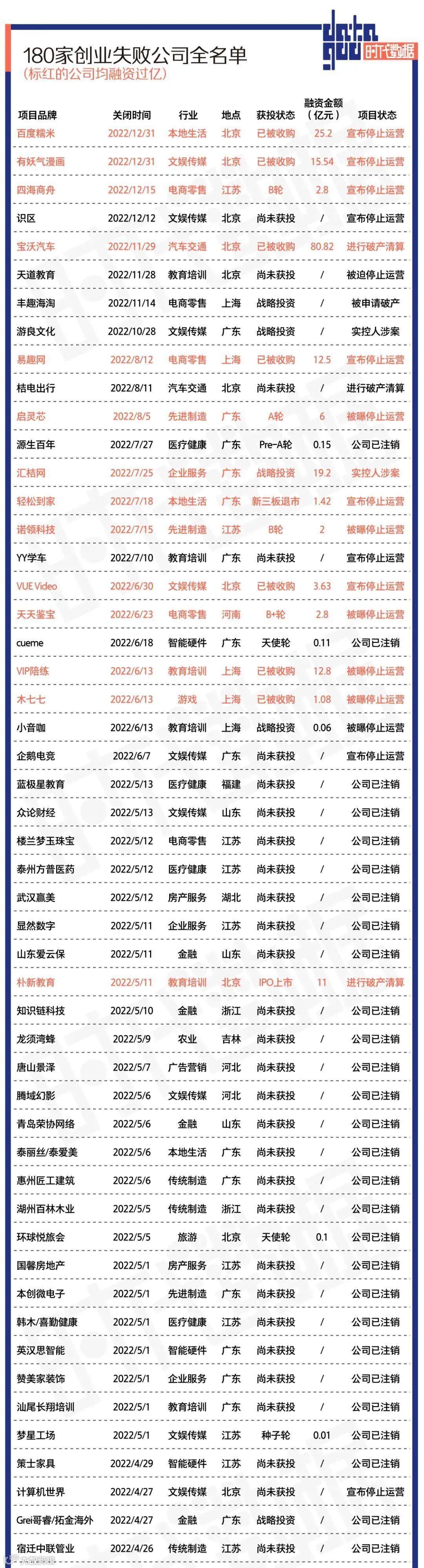 2022年创业公司“死亡”名单及失败原因分析