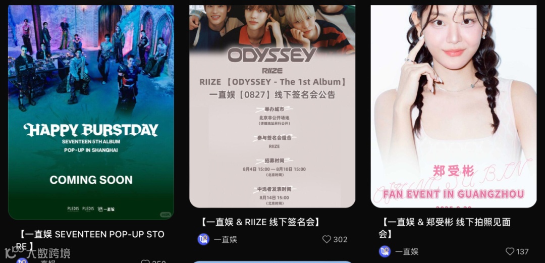 2023年线下活动放开后,不少韩团陆续来华举办小规模签售会。据不完全统计,当下能主办韩国偶像的签售平台多达18个。韩国一线女团Twice就在出道的第十年来到了中国,在上海跳起了《上海之恋》。在小红书搜索「韩团 签售」,未来两月还有不少韩团会来。