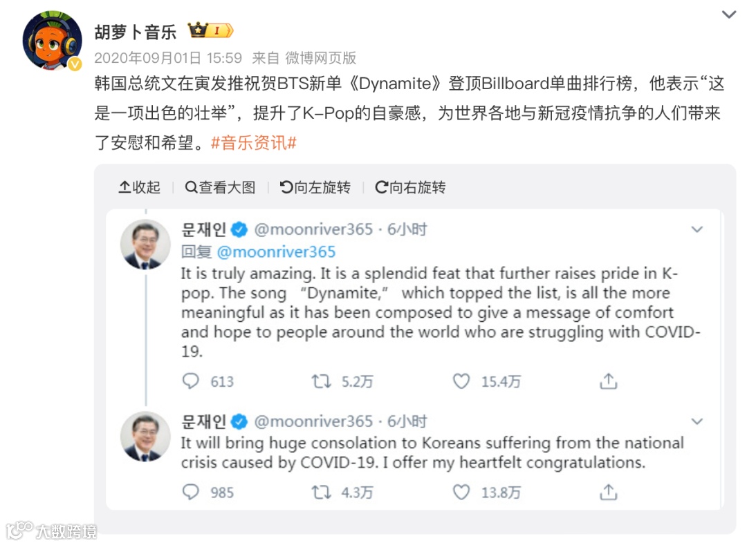 2020年,防弹少年团的英文单曲《Dynamite》空降 Billboard Hot 100 单曲总榜冠军,文在寅随后推文祝贺。这之后,韩国偶像们的礼物单曲常以全英文的形式出现,不少团体也会在即将开启欧美巡演时,发布一张全英专辑。