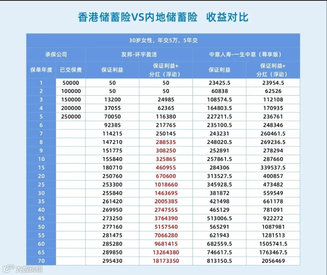 同样的总投入,以友邦环宇盈活为代表的香港储蓄险,预期保单价值20年已经达到内地顶级分红险的1.7倍,40年去到3.5倍,60年去到6.5倍。