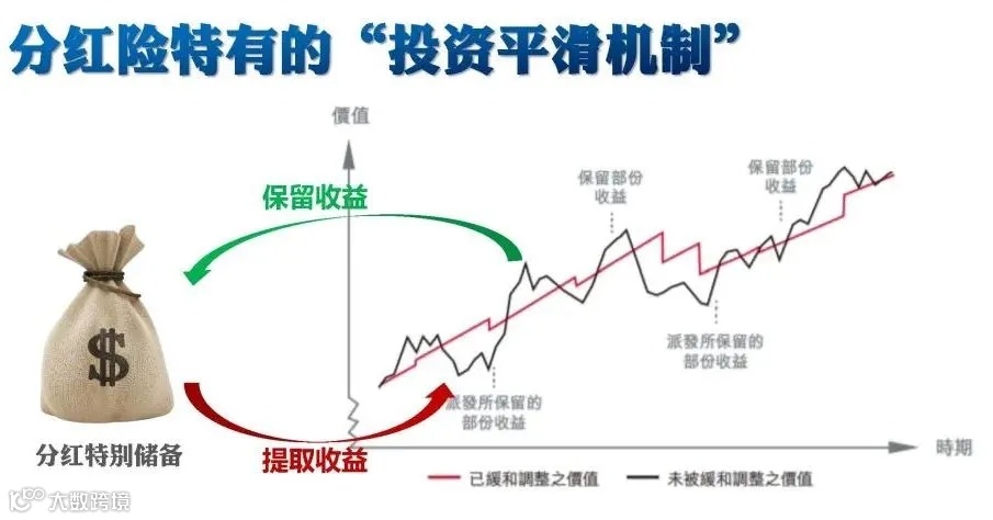 保险公司会在投资收益较好的年份,会将部分收益资金存到“分红特别储备”的账户中,而这笔资金是用于在投资较差的年份分发给客户,此平滑策略可以让保单持有者在保单收益分红中获得相对稳定回报。