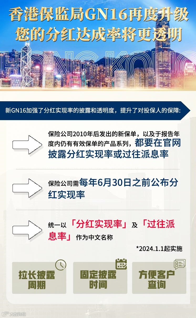 2024年,香港保监局GN16再度升级,新GN16强化了对分红实现率的披露和透明度,并规定保险公司在2010年后出具的新增保单,所有在报告年度内仍然有效的保单产品系列,都必须在每年的6月30日之前,在保险公司的官方网站上公开其分红的实现率或之前的派息率,确保信息公开和透明。