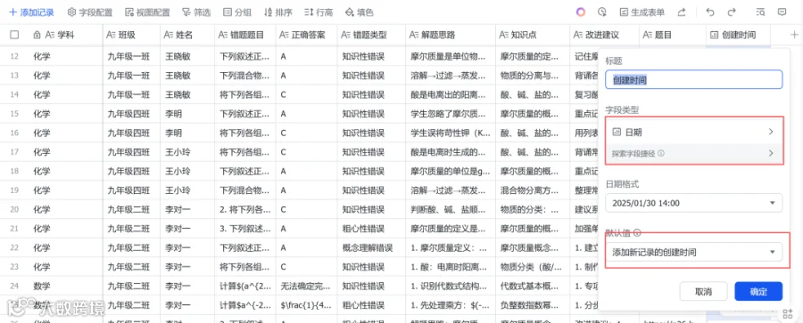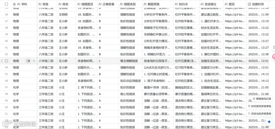 - “学科、班级、姓名、错题题目、正确答案、错题类型、解题思路、知识点、改进建议、题目”的字段类型均是文本格式