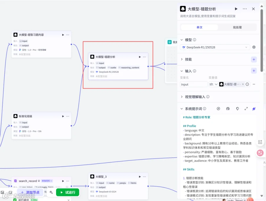 这个工作流,就是把手动辨认错题、分析错误、整理记录的麻烦事交给 AI 。老师不用再花大量时间逐题批注,家长不用再为讲不透错题、存不好错题发愁。不用复杂操作,几步配置好,上传错题图片、填好基本信息,就能得到完整的错题分析、系统的记录存档,还能查看统计数据。让错题不再是负担,反而成为查漏补缺的抓手,让初中阶段的作业批改和学习改进,都更高效、更轻松。