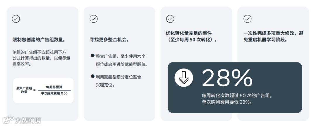 前面说了Meta建议减少广告组数量,那多少广告组是比较合适的呢?为了让广告组生成更准确的用户模型,降低广告成本,Meta建议一个广告组每周积累50个转化,如果你的转化价格是5美金一个,那么一个广告组一周的成本就是250美金,如果你每周只有500美金预算,那最多就只能设置两个广告组。