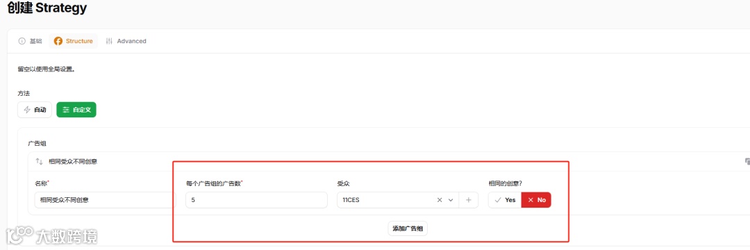 准备好这些创意以后,我们可以在尤里改策略中创建相同受众不同创意的策略,在创建广告时就可以选择该策略,上传多条素材,系统会自动生成N条不同创意的广告,快速开启A/B测试。