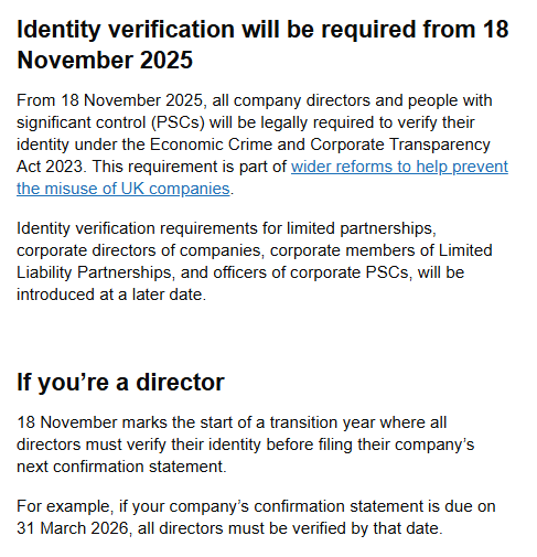 • 2025 年 11 月 18 日之后新注册的英国公司,或新任命的董事,必须 “立即完成验证”,否则无法开展董事职责。