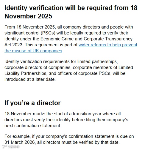 自 2025 年 11 月 18 日起,所有英国有限公司(含 LLP)的董事及实际控股人(PSC)必须在英国工商局(Companies House)完成身份验证并获取唯一个人代码(Personal Code),方可继续行使公司管理权。