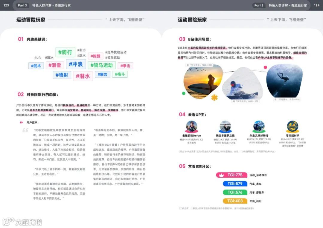 · 行为特征:观看旅行Vlog(如“小张的西域冒险”)、户外装备测评(如帐篷防水测试),通过UP主攻略规划路线。