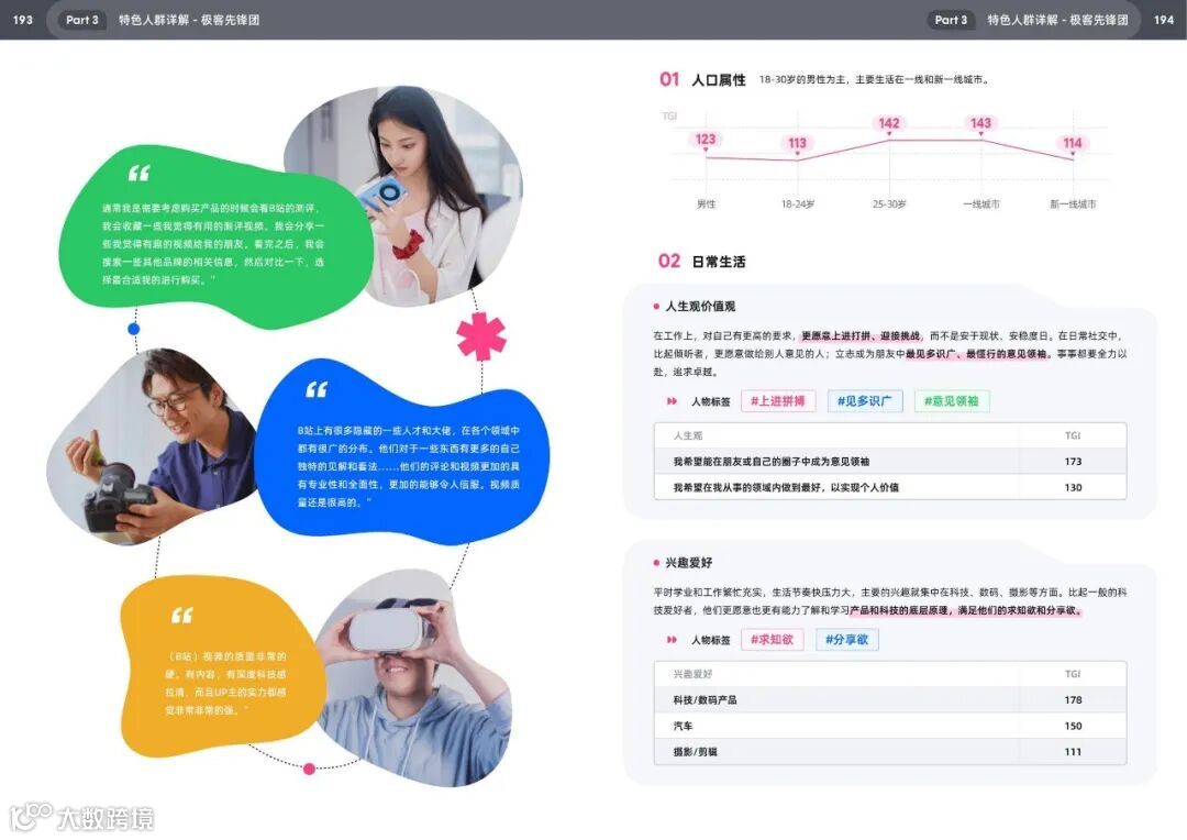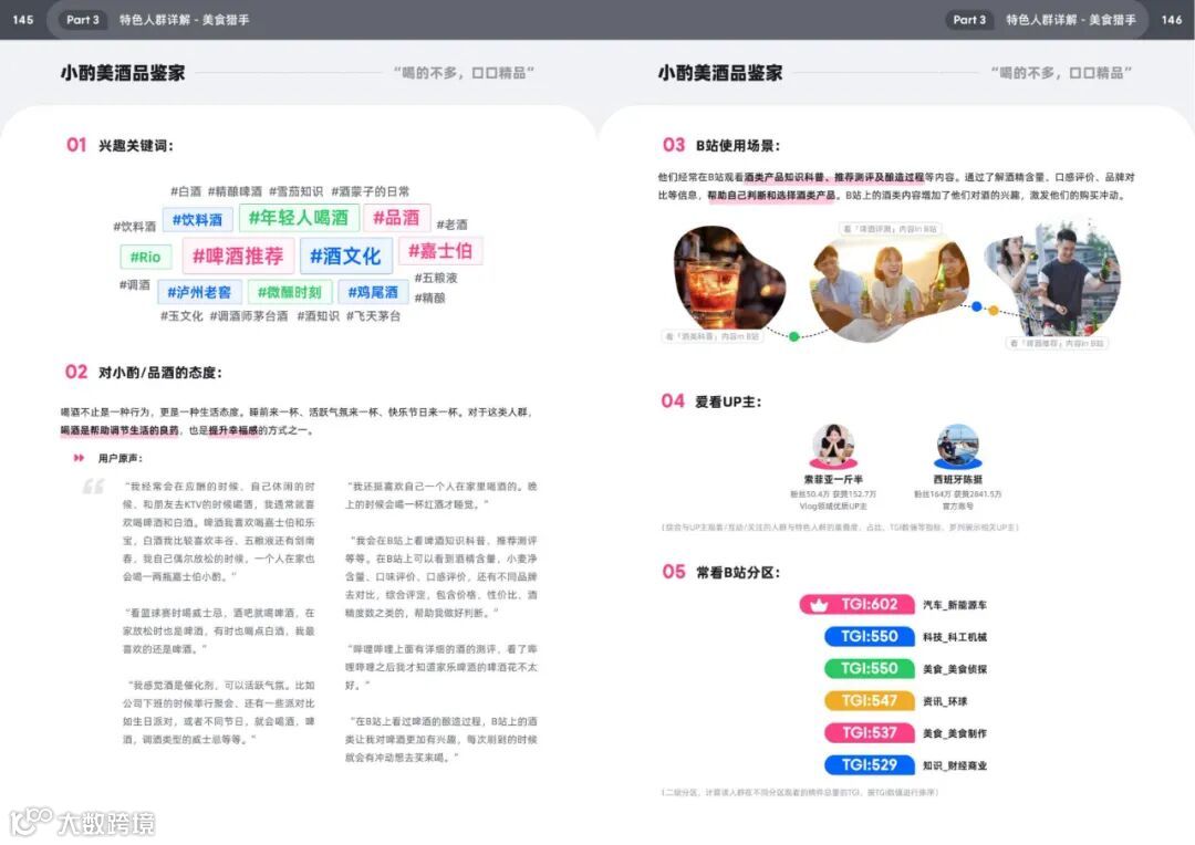 · 行为特征:常看动物圈、生活分区(TGI 143),学习育儿知识(如辅食制作)、家装攻略(如智能灯光设计),信任专业博主(如营养师顾中一)。