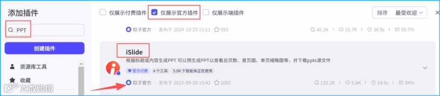 找到扣子官方PPT插件iSlide,本次PPT制作都是用这个插件,根据步骤选择不同的功能,后面不再重复描述本步骤。