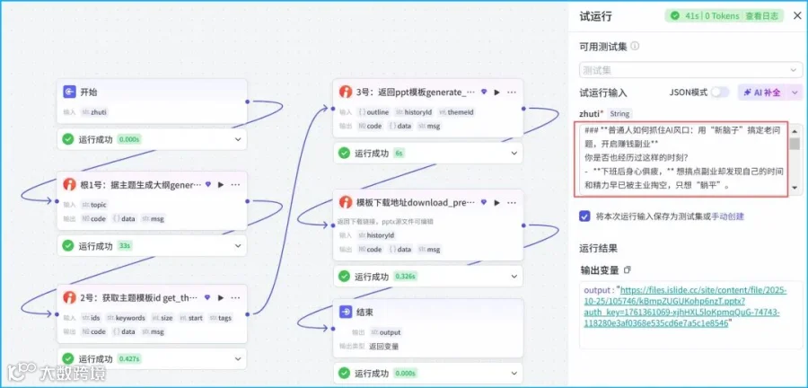 根据测试,输入内容,比只用标题生成的PPT要好些,如果不知道内容怎么写,可以把标题喂给deepseek,让deepseek生成一篇内容,在开始节点粘贴这篇内容。